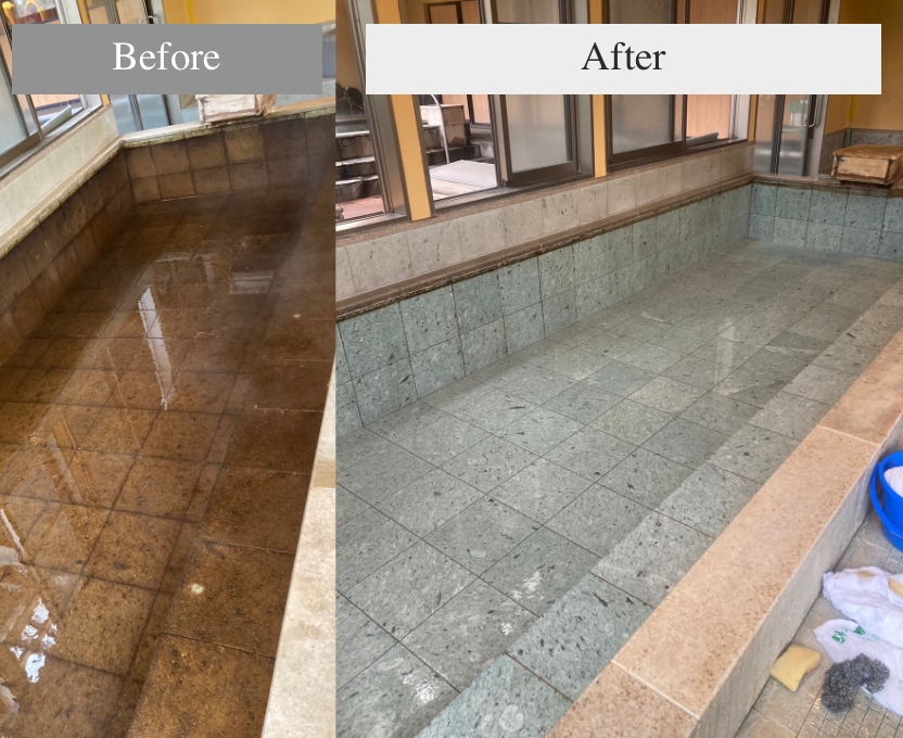 温泉成分による特有な汚れを特殊技術できれいに。湯布院や別府の高級施設でも実績あり。